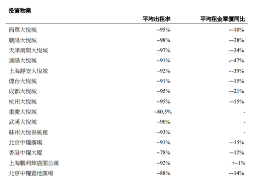 在投資物業(yè)方面,雖然受到疫情影響,但項(xiàng)目均保持了穩(wěn)定且較高的平均出租率,朝陽大悅城出租率最高達(dá)98%,天津南開大悅城出租率97%排在第二,西單大悅城、成都大悅城和杭州大悅城出租率均為95%。值得注意的是,疫情下大部分投資物業(yè)項(xiàng)目的平均租金單價(jià)出現(xiàn)同比下降,其中下降幅度最大的是沈陽大悅城,同比下降47%。