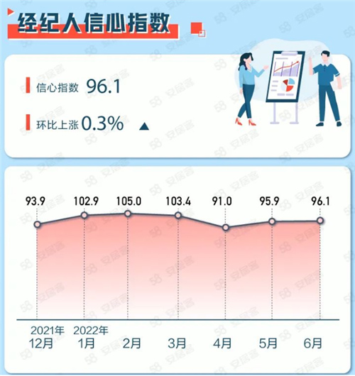 從二手房市場(chǎng)來(lái)看,6月經(jīng)紀(jì)人信心指數(shù)為96.1,環(huán)比微漲0.3%。53.9%的房地產(chǎn)經(jīng)紀(jì)人表示7月份二手房?jī)r(jià)格將基本持平,38.8%的經(jīng)紀(jì)人認(rèn)為7月份二手房市場(chǎng)購(gòu)房需求量環(huán)比將會(huì)上漲。
