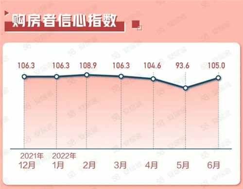 從購(gòu)房者信心來(lái)看,數(shù)據(jù)顯示,6月購(gòu)房者信心指數(shù)為105.0,環(huán)比上漲12.0%。對(duì)于未來(lái)房?jī)r(jià)走勢(shì)的看法,有39.7%的購(gòu)房者表示7月房?jī)r(jià)將基本持平,56.4%的購(gòu)房者認(rèn)為一二線城市的房?jī)r(jià)短期內(nèi)穩(wěn)定,未來(lái)還會(huì)有一定上漲空間。