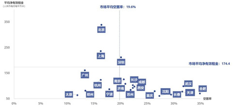 分析來看,北京和上海是最佳市場,因為租金相對較高,而空置率則相對較低。深圳表現(xiàn)也不錯,租金相對處于高位,但是空置率比北京和上海要高一點。廣州、鄭州、寧波等城市的表現(xiàn)則是租金比較低,空置率也不高。其他重點城市理論上就不是很樂觀了,租金都不高,在全國甲級辦公樓的平均租金線之下,空置率則較高,都在20%以上。
