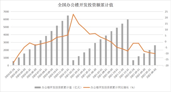 2022年1-6月,全國辦公樓開發(fā)投資額為2616億元,同比下降10.1%,較疫情最初爆發(fā)的2020年也有4%的降幅,是近5年同期數(shù)據(jù)的最低值,反映出企業(yè)開發(fā)投資意愿的低迷。