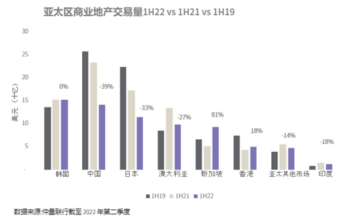 仲量聯(lián)行最新《2022年二季度資本追蹤》報(bào)告顯示,由于加息周期收緊及近期高通脹影響,2022年上半年,中國(guó)、日本、澳大利亞等亞太區(qū)內(nèi)主要市場(chǎng)的商業(yè)地產(chǎn)投資交易活動(dòng)有所放緩,投資額同比下降17%,共錄得709億美元。中國(guó)投資市場(chǎng)由于受到疫情反復(fù)的影響,成交額下降39%,為141億美元。