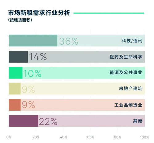 本季新租需求行業(yè)分布較上半年更為多元化,TMT、醫(yī)藥健康和能源及公共事業(yè)靠前但優(yōu)勢不明顯,分別占36%,14%和10%。TMT釋放的需求中以人工智能、區(qū)塊鏈相關(guān)的軟件系統(tǒng)開發(fā)以及電商類的板塊尤為突出,而醫(yī)藥健康行業(yè)隨著融資端的放緩,新租需求以中型成熟企業(yè)擴租為主,新成立和新入京企業(yè)有限。