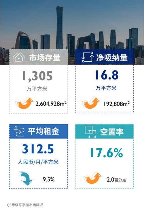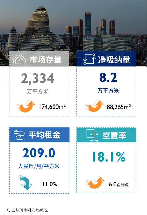 第三季度甲級寫字樓由于幾個新項目集中入市增加413,500平方米的租賃面積,使空置率升至17.6%,和上半年的企業(yè)退租和縮面積引發(fā)的空置率升高略有不同之處,是本季度由于幾個新項目的入市,促使空置率繼續(xù)升高。
