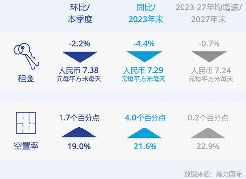 錄得全市平均租金持續(xù)環(huán)比下降2.2%至人民幣7.38元每平米每天,降幅加劇。市場(chǎng)需求的放緩導(dǎo)致業(yè)主方信心仍顯不足。
