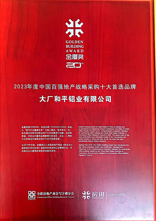 和平鋁業(yè)參加本次年會,并憑借高品質(zhì)的產(chǎn)品和高標準的服務(wù),榮獲「中國地產(chǎn)金廈獎——中國百強地產(chǎn)戰(zhàn)略采購十大首選品牌」榮譽。