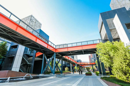 園區(qū)在設(shè)計時將“金隅紅”植入灰色鋪裝中,打造獨具金隅特色的“芯道”,同時靈活運用建筑元素營造特色空間,鋪設(shè)高架步行連廊,采用“高線公園”設(shè)計理念,也串聯(lián)起了散落在場地中的不同功能建筑,增強了建筑群落的立體感和錯落感。