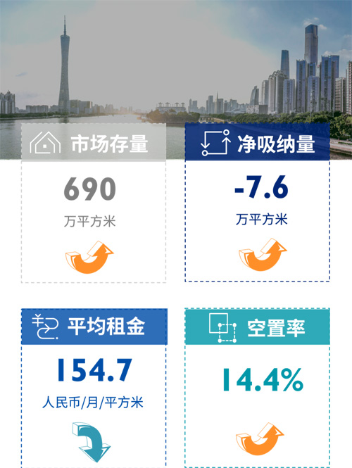 廣州甲級寫字樓市場空置率環(huán)比上升至14.4%;部分業(yè)主面對空置去化壓力延續(xù)下調(diào)租金策略以提高市場關(guān)注度,受此影響,全市甲級寫字樓市場平均租金繼續(xù)下探,錄得154.7元每平方米每月;