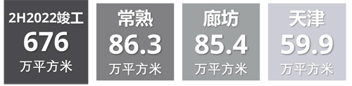 2022年下半年竣工面積最大的城市為常熟,達(dá)86.3萬平方米,廊坊以85.4萬緊隨其后,這兩個(gè)城市都在短期內(nèi)迎來了大量新增供應(yīng)。