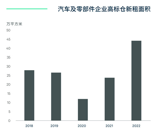 中國產(chǎn)業(yè)升級下供應鏈物流日益重要。近年來狂飆突進的中國新能源汽車產(chǎn)業(yè)帶來了從生產(chǎn)、流通、銷售到后市場的全鏈條高標倉需求的加速擴張。CBRE的統(tǒng)計數(shù)據(jù)顯示,2022年汽車及零部件企業(yè)高標倉新租交易面積近45萬平方米,同比增長86%并創(chuàng)歷史新高。