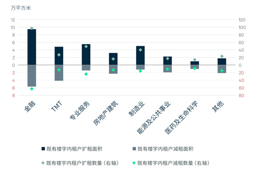 既有樓宇內(nèi)租戶擴減面積規(guī)模(按行業(yè))