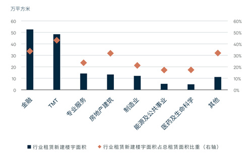 房地產(chǎn)建筑業(yè)也有32%的總租賃面積落位于新建樓宇,主要來自開發(fā)商在新項目中自用面積、地產(chǎn)服務(wù)類公司的升級搬遷以及第三方辦公運營商的擴張布局;