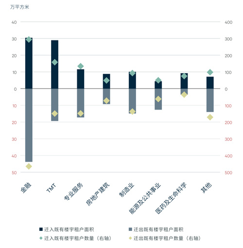 金融是新建樓宇中租賃面積最多的行業(yè),主要吸引保險、證券和基金租戶擴張和升級,以及傳統(tǒng)金融機構(gòu)總部、后臺部門和金融科技類公司進駐。金融在既有樓宇則是遷出多于遷入,以中小型金融機構(gòu)的退出或者替換為主;