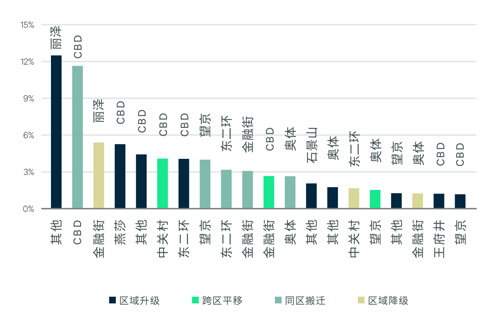注:區(qū)域升級指搬往更高梯隊的商務(wù)區(qū)(區(qū)域按梯隊由高至低分別為核心商務(wù)區(qū)、核心拓展區(qū)、新興商務(wù)區(qū)、其他區(qū)域),以此類推