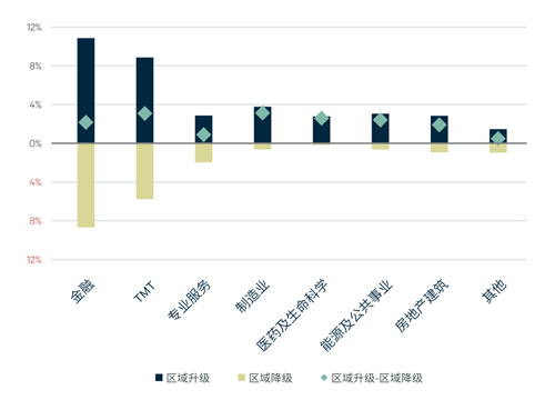 分行業(yè)看,金融和TMT的區(qū)域升級和降級活動均為所有行業(yè)中最活躍的,而TMT體現(xiàn)比金融更明顯的中心化(升級多于降級)。此外,制造業(yè)、醫(yī)藥及生命科學也體現(xiàn)較高的中心化程度,而專業(yè)服務(wù)和其他行業(yè)中的文體娛樂的中心化程度則較低。