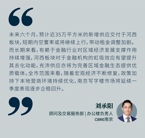 需求方面,金融業(yè)憑借占比近半的租賃需求穩(wěn)居首位。季內(nèi)河西板塊金融行業(yè)集聚優(yōu)勢突出,銀行、保險(xiǎn)與證券等傳統(tǒng)金融機(jī)構(gòu)均有大面積搬遷需求落位,推動板塊內(nèi)部金融生態(tài)不斷完善;與此同時(shí),諸如汽車金融、普惠金融等新興金融業(yè)態(tài)于各個(gè)板塊內(nèi)標(biāo)桿項(xiàng)目錄得成交,為南京實(shí)現(xiàn)“一核兩翼、多點(diǎn)聯(lián)動”的金融中心建設(shè)打下堅(jiān)實(shí)基礎(chǔ)。另外,能源轉(zhuǎn)型的進(jìn)程提速,驅(qū)動以新能源產(chǎn)業(yè)為引領(lǐng)的能源及公共事業(yè)的租賃需求位居第二,升級搬遷與擴(kuò)租需求于多個(gè)板塊持續(xù)放量。后疫情時(shí)代,本土商業(yè)空間運(yùn)營品牌依托逐漸提高的靈活辦公接納程度迎來發(fā)展新機(jī)遇,聚焦新街口核心區(qū)位積極布局。房地產(chǎn)建筑中各細(xì)分行業(yè)租賃需求釋放積極信號,醫(yī)美、培訓(xùn)等多業(yè)態(tài)消費(fèi)服務(wù)韌性發(fā)展,均于新街口及河西有升級擴(kuò)張之勢。