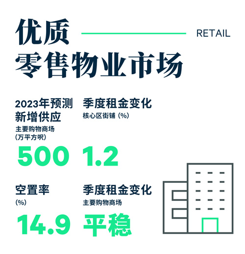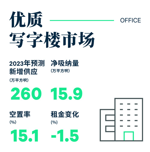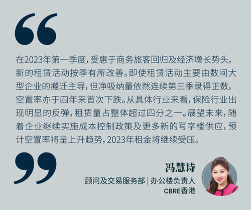 鑒于2023年第一季度未有新寫(xiě)字樓供應(yīng),加上凈吸納量為正數(shù),空置率自2018年第四季度以來(lái)首次下跌0.2個(gè)百分點(diǎn)至15.1%,總空置面積為1,290萬(wàn)平方尺。