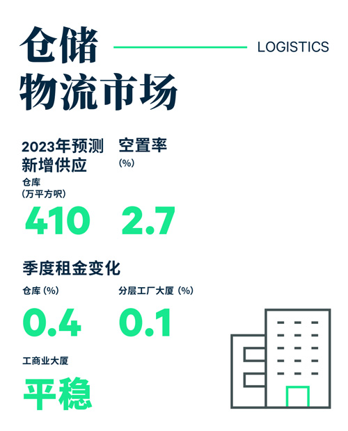 本季度部分中小型單位重新進(jìn)入市場(chǎng),將倉(cāng)庫(kù)空置率輕微推高0.2個(gè)百分點(diǎn)至2.7%。盡管需求疲弱,但低空置率繼續(xù)推動(dòng)倉(cāng)庫(kù)租金,按季上升0.4%,與2022年第四季度的增長(zhǎng)相近。