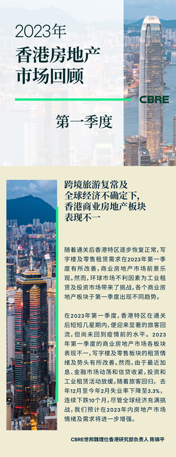 盡管香港PMI今年首兩個(gè)月處于擴(kuò)張區(qū)間,但1-2月貿(mào)易總值按年下跌22.1%,主要是由于出口到中國(guó)內(nèi)地的商品按年下跌30.9%。貨柜吞吐量及航空貨運(yùn)量分別按年下降9.3%和12.9%。由于全球經(jīng)濟(jì)不確定性及可用空間有限,租賃勢(shì)頭在2023年第一季度進(jìn)一步減弱。