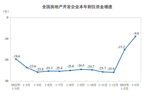 1—3月份,房地產(chǎn)開發(fā)企業(yè)到位資金34708億元,同比下降9.0%。其中,國(guó)內(nèi)貸款4995億元,下降9.6%;利用外資8億元,下降22.7%;自籌資金10171億元,下降17.9%;定金及預(yù)收款11909億元,下降2.8%;個(gè)人按揭貸款6188億元,下降2.9%。