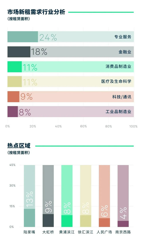 從需求來(lái)看,專業(yè)服務(wù)業(yè)(律師事務(wù)所、企業(yè)咨詢和數(shù)據(jù)服務(wù))、金融業(yè)(其他金融服務(wù)、證券、基金)與消費(fèi)品制造業(yè)是主要的需求驅(qū)動(dòng)力。從區(qū)域來(lái)看,前灘和徐匯濱江等濱江商務(wù)區(qū)凈吸納量居前。至此,全市空置率環(huán)比微升0.5百分點(diǎn)至18.0%。
