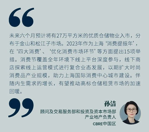 第三方物流仍為需求首位,其中消費(fèi)需求成交占據(jù)主力,消費(fèi)市場(chǎng)活力恢復(fù)帶動(dòng)了倉(cāng)儲(chǔ)去化。大型租賃成交包括兩家奢侈品品牌的配送租賃落地于閔行和松江,一家知名三方物流企業(yè)在金山擴(kuò)租用于其家用電器業(yè)務(wù)的供應(yīng)鏈布局。食品飲料需求亦有提升,本季度錄得傳統(tǒng)糕點(diǎn)品牌在金山一萬(wàn)平方米的新租。然而受年初出口走弱的影響,空置率長(zhǎng)期處于低位的虹橋和浦東機(jī)場(chǎng)子市場(chǎng)出現(xiàn)空置水平上升的情況,均有3-4萬(wàn)平方米的退租。