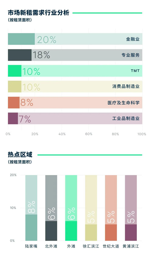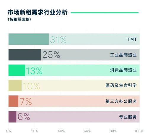 企業(yè)搬遷新租需求進一步釋放落地,市場成交活動呈現(xiàn)積極態(tài)勢。TMT行業(yè)以31%占比穩(wěn)居需求首位,其中平臺互聯(lián)網(wǎng)子分類表現(xiàn)亮眼,錄得醫(yī)療信息、旅游、智慧零售及共享租車等多類型企業(yè)租賃活動;軟件系統(tǒng)開發(fā)類企業(yè)持續(xù)活躍,錄得人工智能、自動駕駛和娛樂體感等前沿領(lǐng)域企業(yè)成交。數(shù)字化滲透在各行業(yè)的應(yīng)用度不斷提高,引領(lǐng)新的產(chǎn)業(yè)發(fā)展方向,推動TMT行業(yè)持續(xù)釋放動能。以芯片為主的工業(yè)品制造業(yè)以25%占比攀升至租賃需求的第二位,芯片國產(chǎn)化趨勢如火如荼,多家企業(yè)布局上海。充分體現(xiàn)作為三大先導(dǎo)產(chǎn)業(yè)之一,上海在集成電路領(lǐng)域持續(xù)深耕,形成頗具集群效應(yīng)的產(chǎn)業(yè)高地。得益于新能源汽車和智能駕駛的發(fā)展,相關(guān)企業(yè)擴租新設(shè)活動推動消費品制造業(yè)以13%的需求占比位居第三。
