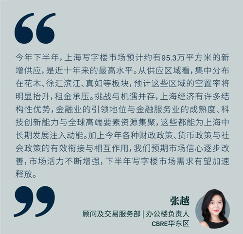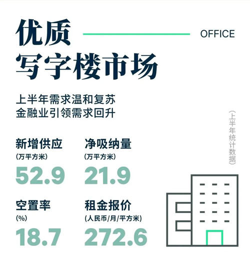 上半年凈吸納量為21.9萬平方米,較去年同期下調(diào)31.6%,其中第二季度凈吸納量180,491平方米,相較于第一季度有明顯回升,市場需求逐漸展現(xiàn)復(fù)蘇跡象。從區(qū)域來看,火車站及徐匯濱江區(qū)域凈吸納量居前。但全市由于新增供應(yīng)量集中,推升全市空置率至18.7%,較去年年底上升1.2個百分點。