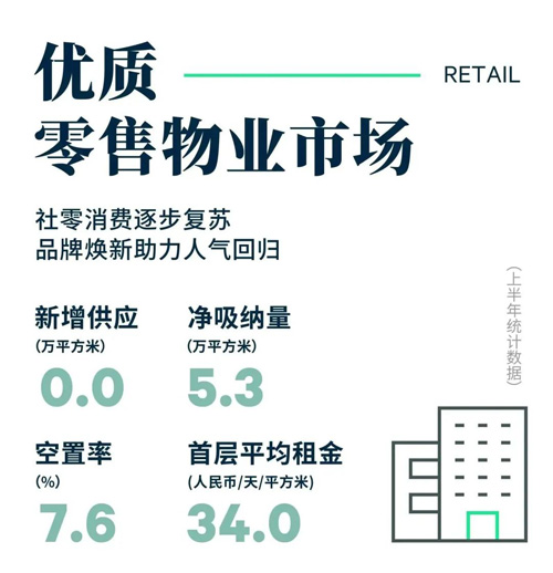 上半年上海零售物業(yè)市場未錄得新項目入市,存量升級項目新天地時尚II煥新回歸,引入眾多新潮首店,打造年輕潮流社交主場。上半年市場凈吸納量錄得5.3萬平方米,其中二季度單季錄得1.9萬平方米,全市空置率環(huán)比下降0.1個百分點,較去年年末下降0.4個百分點至7.6%。租金方面,得益于核心與次級商圈租金的陸續(xù)回暖,全市購物中心首層租金于年初止跌,二季度維持平穩(wěn)走勢,報每天每平方米人民幣34.0元。