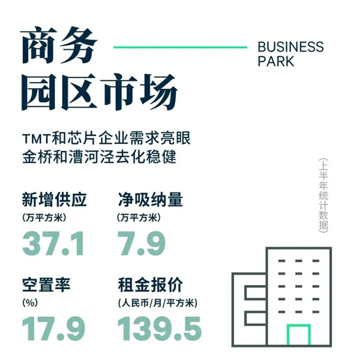 2023年上半年商務(wù)園區(qū)寫字樓市場新增供應(yīng)共錄得五個項目,分別位于漕河涇、金橋、浦江及青浦,共計37.1萬平方米,同比回升47%。其中二季度新增供應(yīng)18.4萬平方米,為金橋的金科園和青浦的趙巷科技綠洲B區(qū)N和趙巷科技綠洲C區(qū)。新增供應(yīng)回暖,需求波動復(fù)蘇,上半年累計凈吸納量7.9萬,其中二季度凈吸納量2.7萬平方米。因此,上半年市場空置率累計上行2.1個百分點至17.9%。