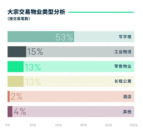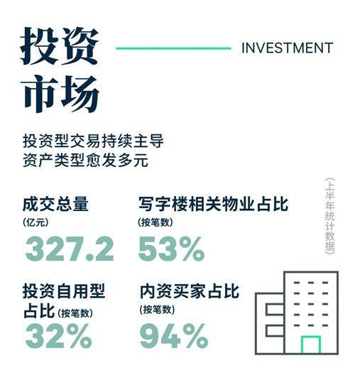 買家類型方面,企業(yè)仍為上半年市場交易金額占比最大的買家,除近期專業(yè)服務(wù)業(yè)、能源與科技公司相繼購置自用辦公物業(yè)外,企業(yè)以投資為目的布局地產(chǎn)板塊的情況屢見不鮮。此外,以保險公司為代表的機構(gòu)投資者亦展現(xiàn)出強勁購買力,連續(xù)錄得大額交易落地;地產(chǎn)基金投資活躍度依舊,完成多筆長租公寓相關(guān)交易,二者聯(lián)合地產(chǎn)公司占據(jù)上半年交易總額的半壁江山。