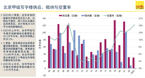 值得注意的是,二季度全市凈吸納量再次錄得負值,僅為-13,460平方米,繼去年四季度之后連續(xù)三個季度凈吸納量出現(xiàn)負值。2023年上半年,全市甲級寫字樓市場累積凈吸納量約為-1.67萬平方米,整體去化壓力有增無減。