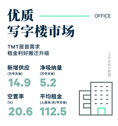 回顧上半年,疫情期間積壓的需求在年初得到釋放,但由二季度起,市場需求復(fù)蘇小幅放緩,較為有限的需求增量加劇市場競爭,租金環(huán)比下調(diào)0.7%,上半年累計下調(diào)1.0%至每月每平方米112.5元。