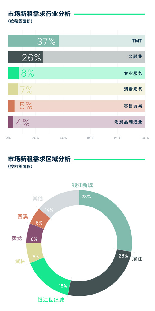 成交類型方面,內(nèi)資租戶的搬遷擴張依舊是杭州寫字樓租賃活動的主要引擎,1,000平方米以下中小面積段成交逾八成,而金融業(yè)及專業(yè)服務(wù)業(yè)的升級搬遷需求撬動2,000平方米以上面積段租賃成交。低點租金利好存量客戶搬遷升級,占比67%;而新設(shè)需求僅占總體需求的15%。成交區(qū)位方面,錢江新城板塊需求持穩(wěn),依舊是金融業(yè)及專業(yè)服務(wù)業(yè)租戶品質(zhì)升級的首選區(qū)位,而濱江板塊受到新項目較好的租賃表現(xiàn)帶動,上半年需求活躍,其中超半數(shù)租賃活動源自TMT相關(guān)租戶。
