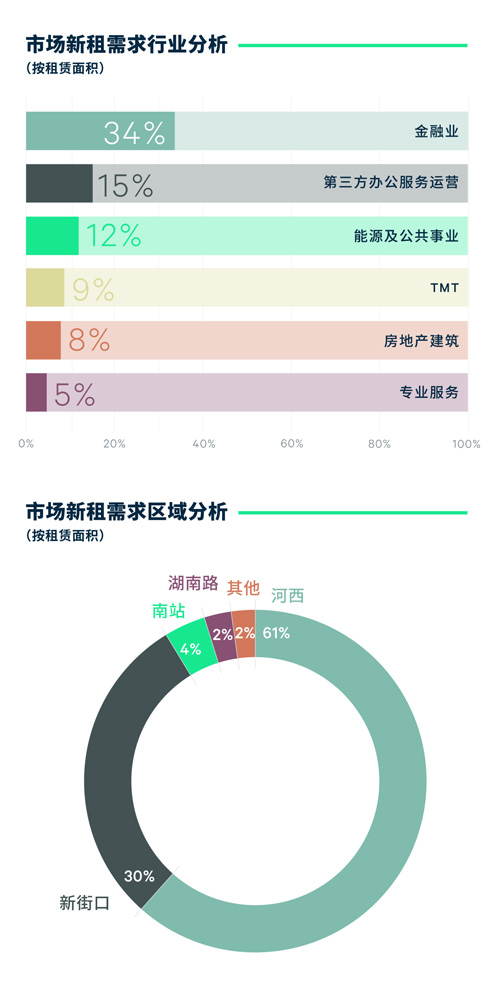 需求方面,金融業(yè)以銀行及保險機構(gòu)為引領(lǐng)釋放穩(wěn)定租賃需求。河西板塊金融能級不斷提升,廣泛吸納銀行、保險及證券公司等大面積搬遷需求,而基金與普惠金融類新興業(yè)態(tài)呈現(xiàn)多板塊分布態(tài)勢,在新街口、南站、湖南路等區(qū)域亦錄得成交。市場修復加劇需求動能更迭,第三方辦公服務(wù)運營商積極擴張,躍居第二。本土商業(yè)空間運營品牌緊抓核心板塊租金窗口期鎖定成本優(yōu)勢,連續(xù)兩個季度錄得新設(shè)點位。此外,新能源及環(huán)保相關(guān)產(chǎn)業(yè)競爭力增強,驅(qū)動能源及公共事業(yè)類企業(yè)升級需求保持堅挺;電商與平臺互聯(lián)網(wǎng)公司為首的科技企業(yè)租賃需求于河西及南站等板塊持續(xù)放量。