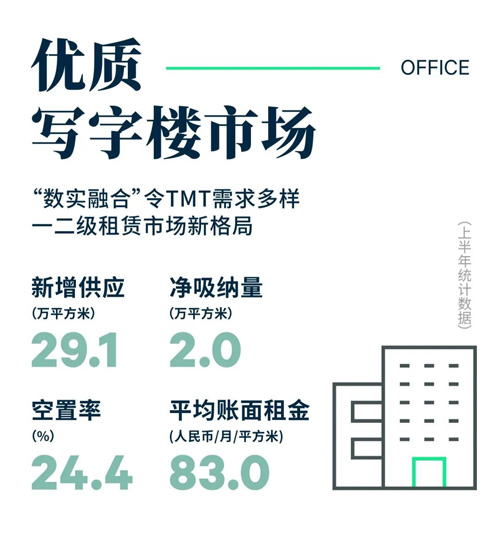 相應地,優(yōu)質(zhì)寫字樓市場整體空置率較去年底上升3.6個百分點至24.4%;以價換量為市場去化的主旋律,導致平均租金仍處下行通道,跌幅為0.6%。
