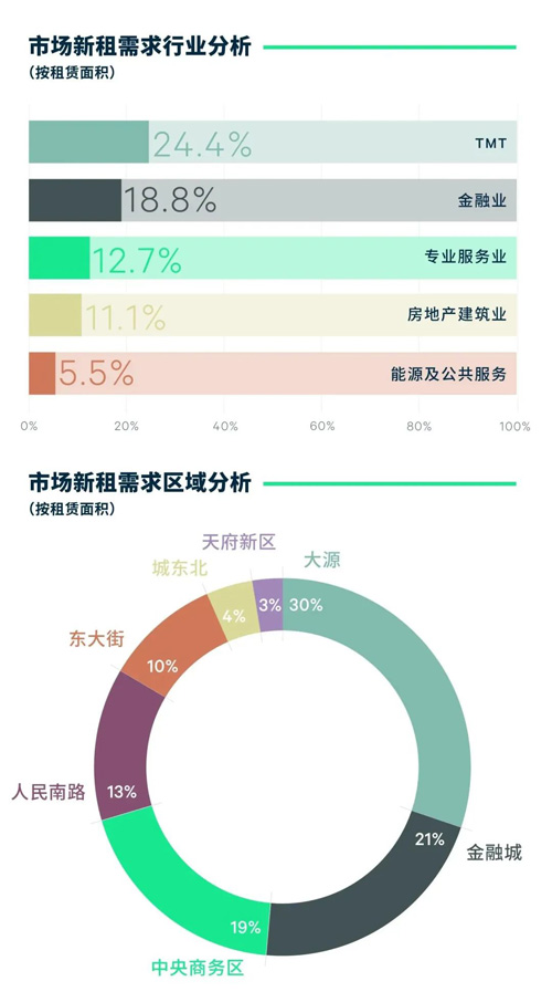 具體而言,“數(shù)實融合”發(fā)展背景之下,成都數(shù)字化與工業(yè)化加速融合發(fā)展,不僅為TMT需求增長續(xù)以動能,也令細分行業(yè)需求日趨多樣。統(tǒng)計顯示,上半年工業(yè)互聯(lián)網(wǎng)需求占比攀升至82.1%,且其中不乏農(nóng)業(yè)科技、房地產(chǎn)科技、數(shù)字工業(yè)設計等“數(shù)實融合”典型案例的需求落地;51.2%的TMT需求為內(nèi)資企業(yè)貢獻;34.9%的TMT需求落于大源。