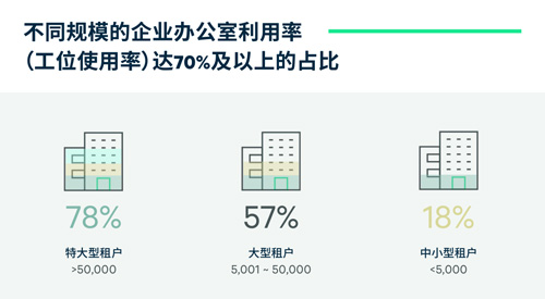 整體而言,由于國內(nèi)辦公習(xí)慣受居家辦公影響較小,辦公室平均利用率達到67%,高于全球其他區(qū)域。其中,特大型租戶(全國辦公面積大于50,000平方米)使用率更高,對空間靈活性和健康元素要求也更高。而中小型租戶則受制于空間職能的單一性,利用率較低。
