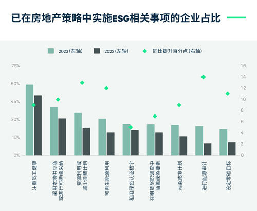 今年調(diào)查結(jié)果顯示,企業(yè)在房地產(chǎn)規(guī)劃和運營中落實ESG戰(zhàn)略的進程全方位提速。在繼續(xù)把關(guān)注員工健康作為首要ESG舉措的同時,能源審計、資源循環(huán)利用和設(shè)定凈零目標(biāo)的實施力度大幅提升。