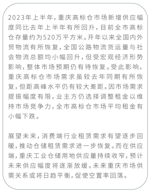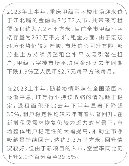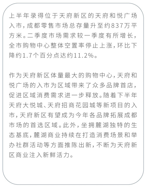 上半年成都寫字樓市場需求穩(wěn)步復(fù)蘇,退租面積環(huán)比顯著回落,凈吸納量由負(fù)轉(zhuǎn)正,得益于成都在新能源龍頭企業(yè)和中小企業(yè)集聚度上的顯著提升,能源類企業(yè)成需求增長新亮點。成都零售市場活躍度較去年同期有所回升,天府新區(qū)商業(yè)加速發(fā)展;天府和悅廣場以高入駐率開業(yè),開業(yè)期間優(yōu)異的人流量和銷售業(yè)績增強了市場對天府新區(qū)商業(yè)發(fā)展的信心。物流市場供應(yīng)量回落,降本增效成主流,市場需求回歸理性。
