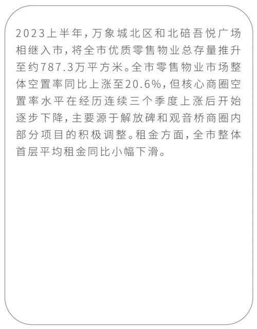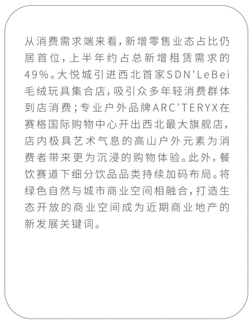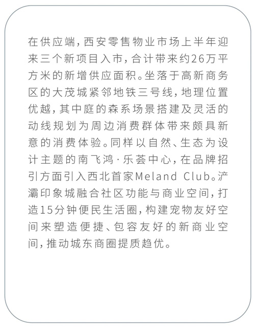 上半年,西安甲級寫字樓市場未錄得新項目入市,截至目前已連續(xù)四個季度無新增供應(yīng)。供應(yīng)端放緩在一定程度上緩解了租賃去化壓力,市場呈平穩(wěn)去化態(tài)勢。西安零售物業(yè)市場上半年整體運營平穩(wěn),消費需求活躍度呈緩慢回升態(tài)勢。將綠色自然與城市商業(yè)空間相融合,打造生態(tài)開放的商業(yè)空間成為近來商業(yè)地產(chǎn)的新發(fā)展關(guān)鍵詞。