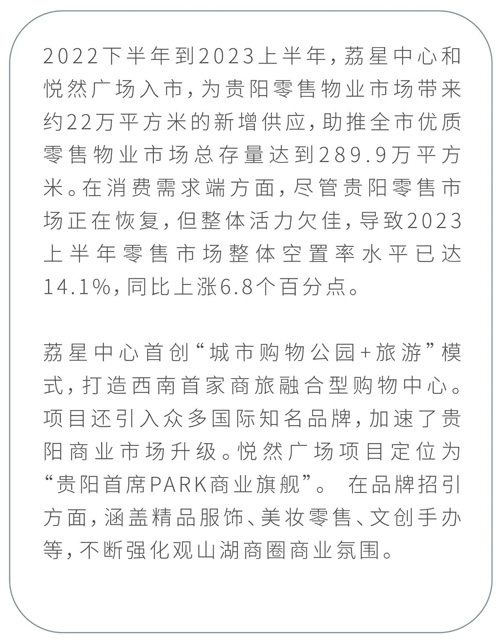 甲級寫字樓市場雖受近一年內(nèi)經(jīng)濟環(huán)境影響,外來租賃需求增長乏力,但優(yōu)質(zhì)項目的不斷入市激發(fā)了本地租戶升級搬遷需求,未來單一業(yè)權(quán)優(yōu)質(zhì)項目或?qū)⒊掷m(xù)保持目前良好的發(fā)展態(tài)勢。貴陽零售消費市場整體運行平穩(wěn),新項目入市有利于提升貴陽商業(yè)項目整體品質(zhì)。