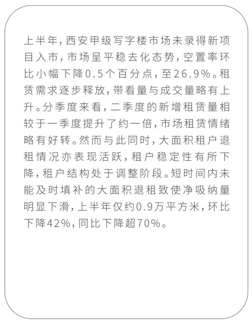 上半年,西安甲級(jí)寫(xiě)字樓市場(chǎng)未錄得新項(xiàng)目入市,截至目前已連續(xù)四個(gè)季度無(wú)新增供應(yīng)。供應(yīng)端放緩在一定程度上緩解了租賃去化壓力,市場(chǎng)呈平穩(wěn)去化態(tài)勢(shì)。西安零售物業(yè)市場(chǎng)上半年整體運(yùn)營(yíng)平穩(wěn),消費(fèi)需求活躍度呈緩慢回升態(tài)勢(shì)。將綠色自然與城市商業(yè)空間相融合,打造生態(tài)開(kāi)放的商業(yè)空間成為近來(lái)商業(yè)地產(chǎn)的新發(fā)展關(guān)鍵詞。