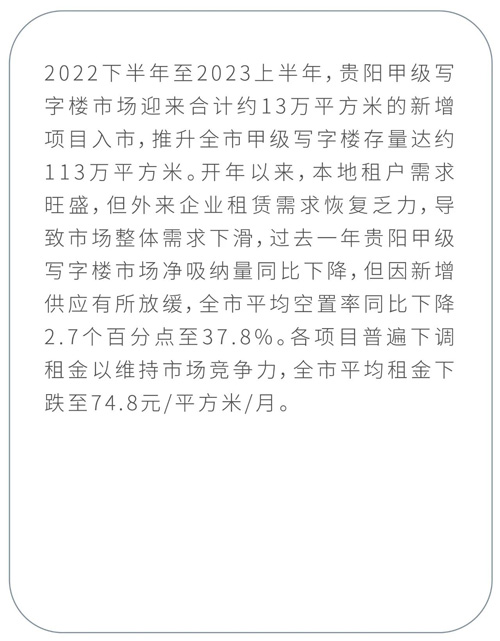 甲級寫字樓市場雖受近一年內(nèi)經(jīng)濟(jì)環(huán)境影響,外來租賃需求增長乏力,但優(yōu)質(zhì)項(xiàng)目的不斷入市激發(fā)了本地租戶升級搬遷需求,未來單一業(yè)權(quán)優(yōu)質(zhì)項(xiàng)目或?qū)⒊掷m(xù)保持目前良好的發(fā)展態(tài)勢。貴陽零售消費(fèi)市場整體運(yùn)行平穩(wěn),新項(xiàng)目入市有利于提升貴陽商業(yè)項(xiàng)目整體品質(zhì)。