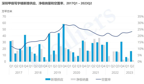 本季度全市甲級(jí)寫(xiě)字樓凈有效租金環(huán)比下降2.7%至人民幣191.7元每月每平方米。不乏個(gè)別項(xiàng)目給出較大的降幅以求促進(jìn)去化。季末全市平均空置率環(huán)比上升1個(gè)百分點(diǎn)至23.4%,供應(yīng)壓力疊加具有高成長(zhǎng)性的需求不足,下半年空置率料將面臨上行壓力。