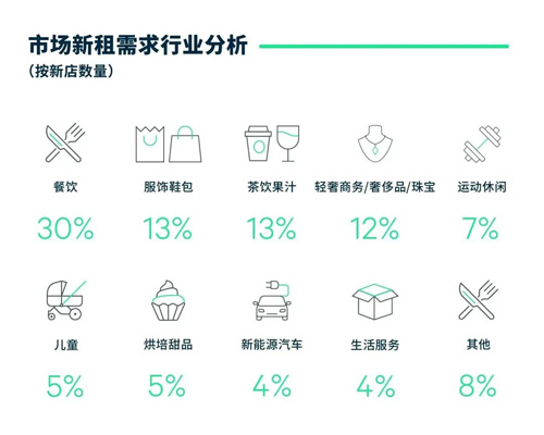 季內(nèi)租賃需求穩(wěn)中有升,客流持續(xù)復(fù)蘇,尤其是節(jié)假日期間王府井、五棵松、中關(guān)村等熱門商圈客流量同比增長2-4倍。首店經(jīng)濟(jì)持續(xù)發(fā)力,新增項(xiàng)目、核心商圈及社區(qū)屬性較強(qiáng)的購物中心皆有眾多餐飲及零售的北京或區(qū)域首店落位。餐飲需求回暖較快,占據(jù)總新增店鋪數(shù)量的40%(如侘與火、隱泉之語、東粵洋樓)。零售業(yè)態(tài)本季亦表現(xiàn)良好,其中由服飾鞋包(如Badmarket、Blanc&Eclare、JNBY)、輕奢商務(wù)(如Sergio Rossi、45R、Atsuro Tayama)及運(yùn)動休閑(如Kailas、始祖鳥、Satisfy、Pas Normal Studios)領(lǐng)跑,合計(jì)占據(jù)總新增店鋪數(shù)量的27%。M Stand、茶話弄、霸王茶姬等茶飲果汁類網(wǎng)紅品牌拓店節(jié)奏依舊穩(wěn)健,落位在合生匯、龍湖大興天街、朝陽大悅城等優(yōu)質(zhì)購物中心。兒童體驗(yàn)類業(yè)態(tài)及新能源汽車本季熱度減弱?v觀上半年,餐飲、服飾鞋包及茶飲果汁位列需求引擎前三名。