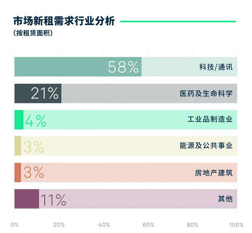 得益于生命科學(xué)園區(qū)新項(xiàng)目的預(yù)租表現(xiàn)以及來(lái)自醫(yī)藥、TMT和金融類(lèi)企業(yè)的新租需求,本季整體市場(chǎng)錄得凈吸納量12.2萬(wàn)平方米,環(huán)比上漲49%,其中超過(guò)11萬(wàn)平方米的吸納來(lái)自具備研發(fā)功能的產(chǎn)業(yè)園項(xiàng)目。在互聯(lián)網(wǎng)頭部企業(yè)大面積騰退來(lái)到尾聲,疊加業(yè)主下調(diào)租金刺激新租需求的大環(huán)境下,全年全市凈吸納量28.0萬(wàn)平方米,同比上漲162%。TMT和醫(yī)藥蟬聯(lián)年度主力需求,以人工智能、軟件開(kāi)發(fā)為主的TMT企業(yè)占比高達(dá)58%,醫(yī)藥及生命科學(xué)占比約21%,而能源及公共事業(yè)企業(yè)亦在年內(nèi)釋放需求排名第三。