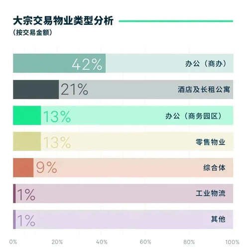 從交易資產(chǎn)類(lèi)別看,季內(nèi)兩筆交易為核心商圈品牌酒店且金額占比近八成。核心商圈運(yùn)營(yíng)成熟的酒店擁有穩(wěn)定現(xiàn)金流,區(qū)域價(jià)值的不斷提升以及項(xiàng)目自身的增值潛力,加上酒店本身多元復(fù)合的功能和使用場(chǎng)景,成為吸引投資者進(jìn)行資產(chǎn)配置優(yōu)勢(shì)的核心優(yōu)勢(shì)。全年來(lái)看,資產(chǎn)類(lèi)別和市場(chǎng)參與者更顯多元化,在可售優(yōu)質(zhì)資產(chǎn)增加的推動(dòng)下,商務(wù)園區(qū)、零售物業(yè)、酒店以及長(zhǎng)租公寓三大板塊的占比分別為13%、13%和21%,同比均有明顯上升,擠壓作為傳統(tǒng)主流交易資產(chǎn)類(lèi)別的商辦類(lèi)資產(chǎn)占比降至42%。