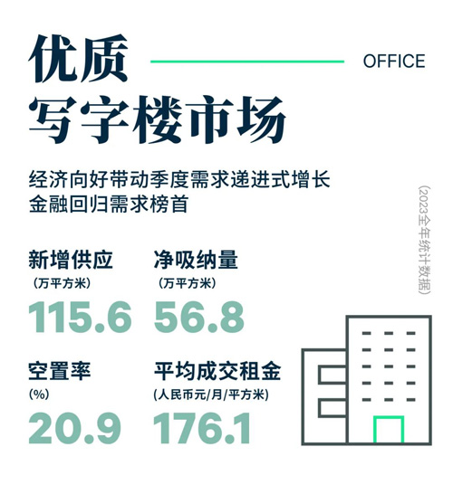 經(jīng)濟(jì)回升向好帶動(dòng)優(yōu)質(zhì)寫(xiě)字樓市場(chǎng)需求逐季遞進(jìn)式改善,第四季度以價(jià)換量帶動(dòng)市場(chǎng)需求實(shí)現(xiàn)了進(jìn)一步改善,當(dāng)季共錄得18.0萬(wàn)平方米的凈吸納量,同比及環(huán)比增長(zhǎng)明顯,分別上漲76.3%和20.0%。全年凈吸納量共計(jì)56.8萬(wàn)平方米,同比躍升44.8%,但與疫情前的年均水平相比仍有一定差距。受新增供應(yīng)以及需求尚未完全修復(fù)影響,整體市場(chǎng)空置率同比上升2.1個(gè)百分點(diǎn)至20.9%,與疫情前的2019年趨同。