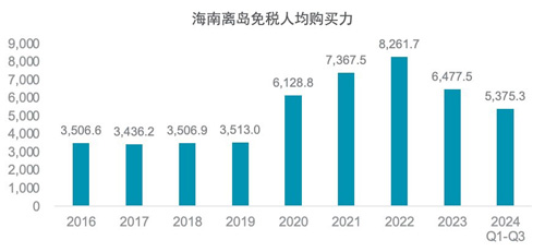 過去四年對(duì)房地產(chǎn)市場的深度調(diào)整對(duì)中產(chǎn)收入群體帶來了巨大打擊,資產(chǎn)貶值導(dǎo)致的家庭財(cái)富縮水也是目前消費(fèi)復(fù)蘇遲緩的重要原因。以海南離島免稅人均購買力為例,2024年前三季度海南離島免稅人均購買力從2022年8261元/人的頂點(diǎn)下降至5375元/人,降幅高達(dá)35%。